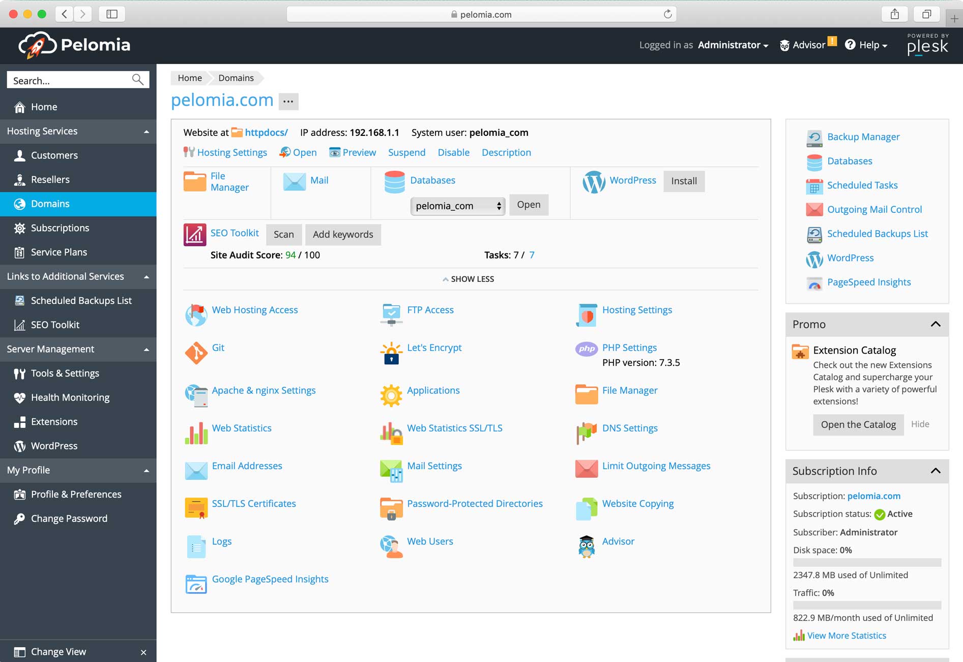 Plesk est une interface permettant l’administration de la plateforme d’hébergement en quelques clics sans la moindre ligne de commande.